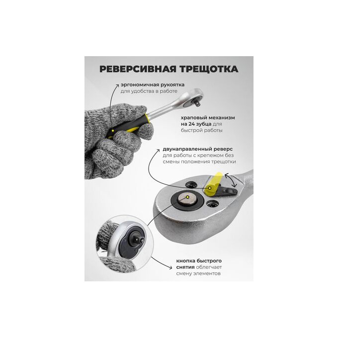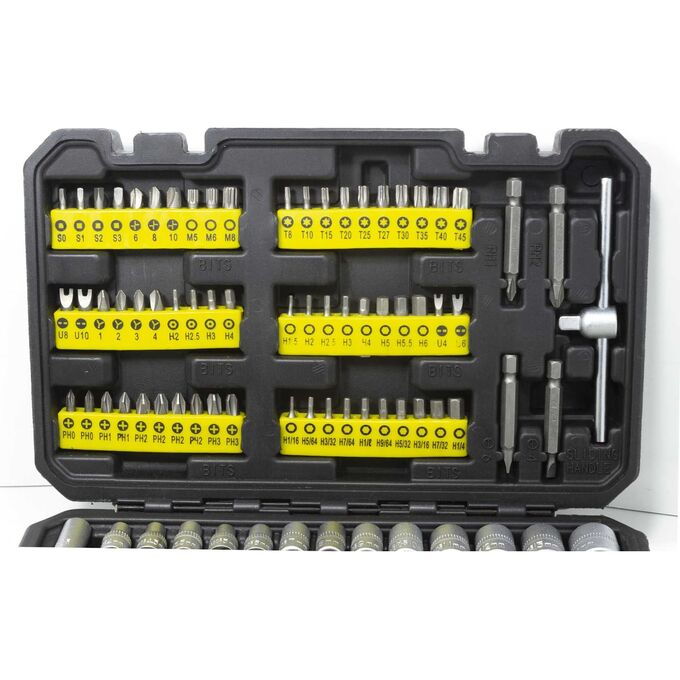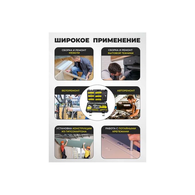Качество и прочность. Каждый инструмент изготовлен из высококачественных материалов, обеспечивая долговечность и надежность в использовании. Набор содержит головки торцевые, биты, ключи различных размеров, а также специализированные биты для работы с различными видами крепежа.