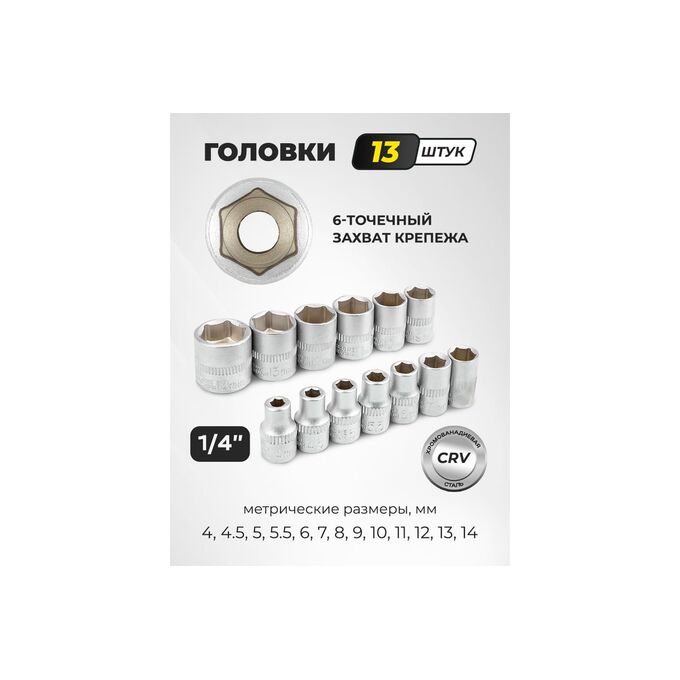 - Головки торцевые (4, 4.5, 5, 5.5, 6, 7, 8, 9, 10, 11, 12, 13, 14 мм.)