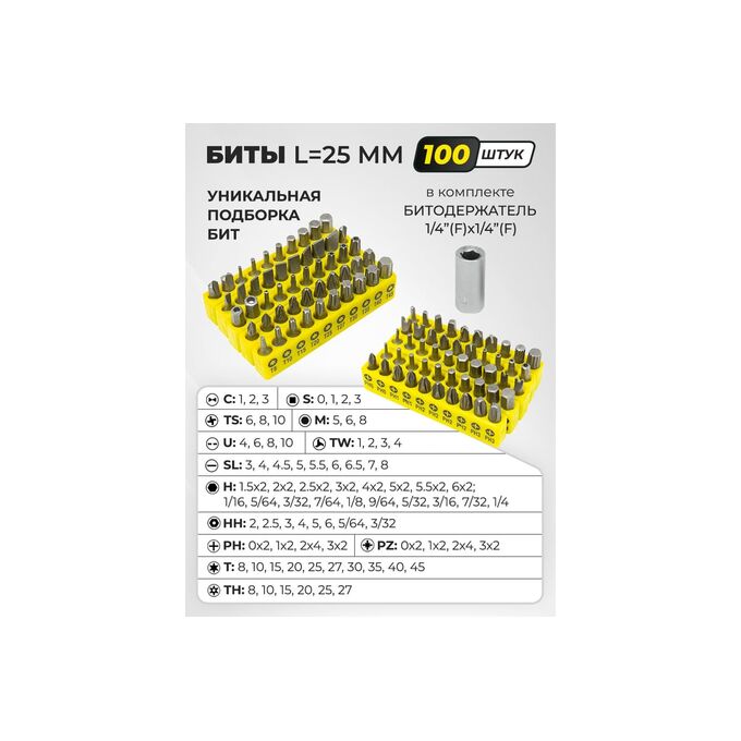 - Биты 50 мм: SL ( 4, 6), PH (1, 2)