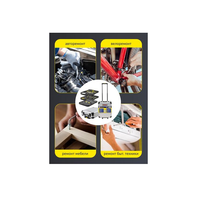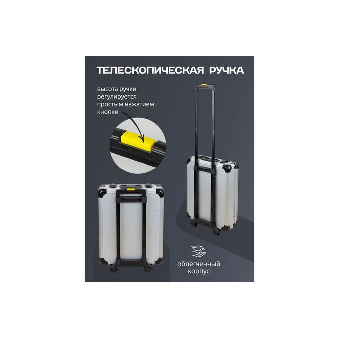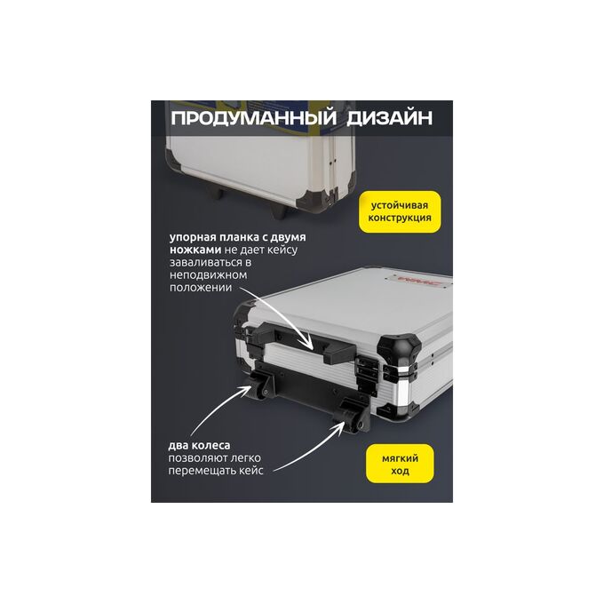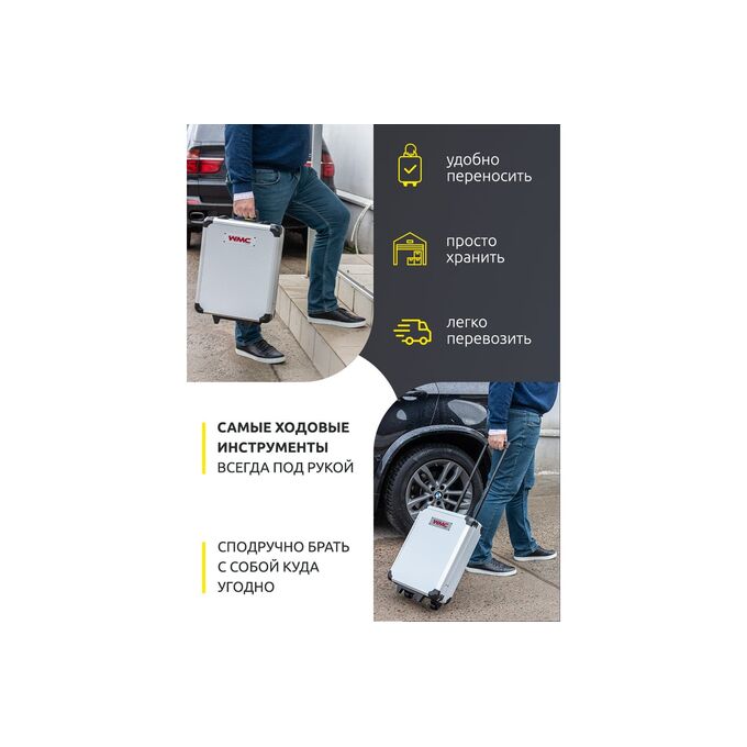 Удобство использования. Удобный алюминиевый кейс с телескопической ручкой, который легко поместится в багажник вашего авто. Кроме того, этот набор инструментов можно легко транспортировать до необходимого места, благодаря встроенным в кейс колесикам.