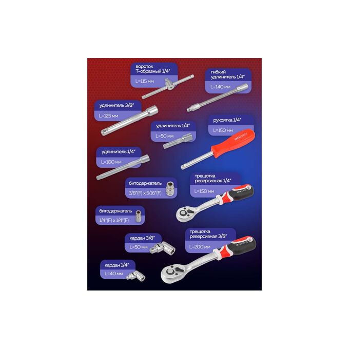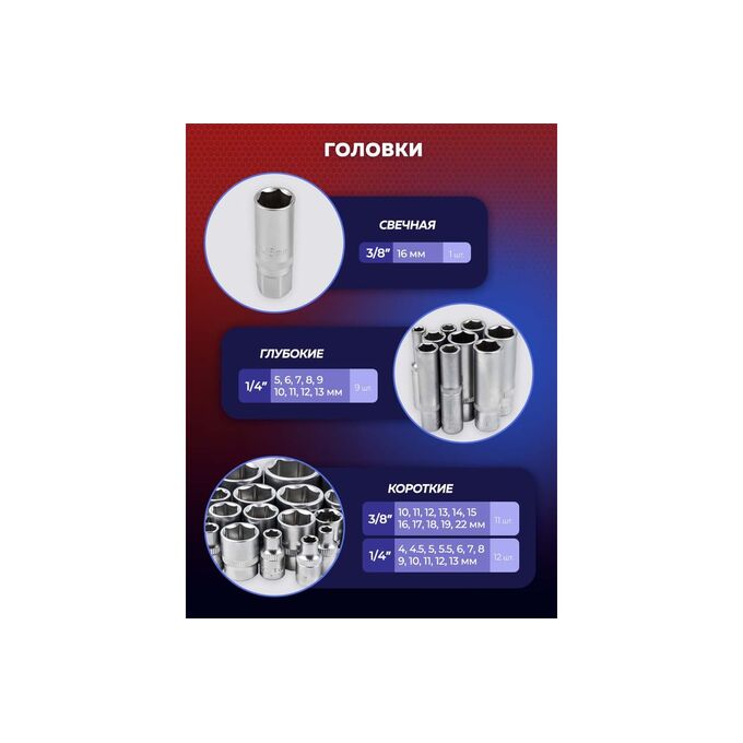 Данный набор инструмента широко используется в автомобильной и промышленной отраслях, в гараже, в дороге, на даче и дома в быту ,где повреждение гаек и болтов является довольно распространенной проблемой. Он также может быть полезен в ремонтных и строительных работах. Посадочный квадрат: 3/8", 1/4". Тип головок: универсальный профиль, Е-профиль, короткие, глубокие. Вес набора 3,28 кг. Размеры 30х24х7 см.
