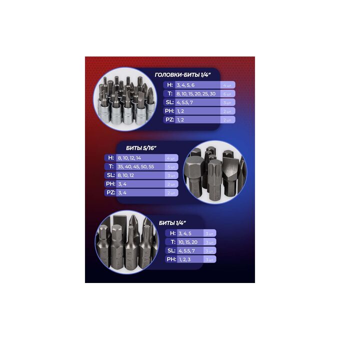 - Биты 5/16": H: 8, 10, 12, 14: T: 35, 40, 45, 50, 55; SL: 8, 10, 12; PH: 3, 4; PZ:3, 4.