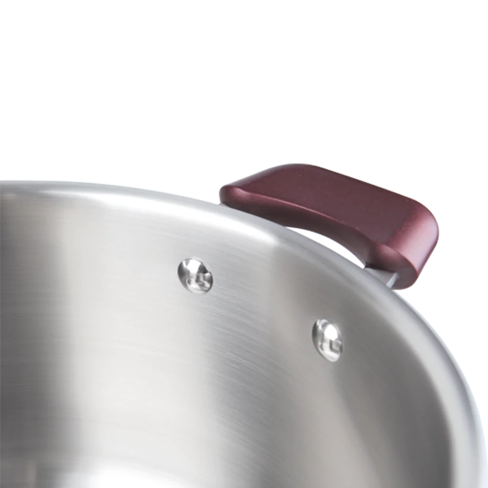 Материал: высококачественная нержавеющая сталь 18/10. Внутреннее покрытие: без покрытия. Толщина стенок: 0,5 мм. Толщина дна: 5,0 мм. Материал крышки: термостойкое стекло. Аксессуары: из бакелита, с покрытием Soft Touch. Преимущества: высокие стенки корпуса – большой литраж посуды.