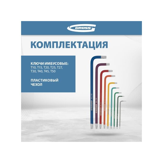 Набор ключей имбусовых GROSS 16402 Torx-TT, 9 шт T10-T50, магнит, S2, экстра-длин., хром/краска 9 шт.