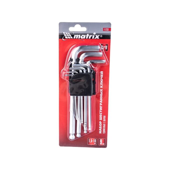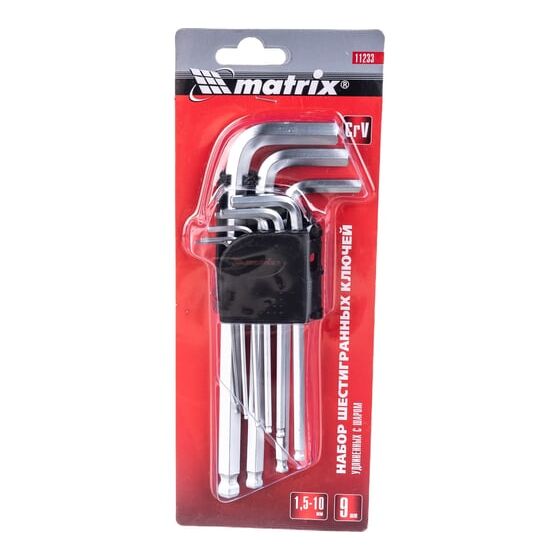 Набор ключей имбусовых MATRIX 11233 HEX, 1,5–10 мм, CrV, 9 шт., удлиненные, сатин., с шаром
