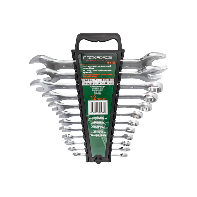 Набор ключей комбинированных и рожковых 12 предметов на пластиковом держателе от бренда ROCKFORCE- самый распространённый и популярный тип гаечного ключа, сочетающий в конструкции рожковый и накидной профили. Использование двух одноразмерных профилей делает инструмент универсальным.