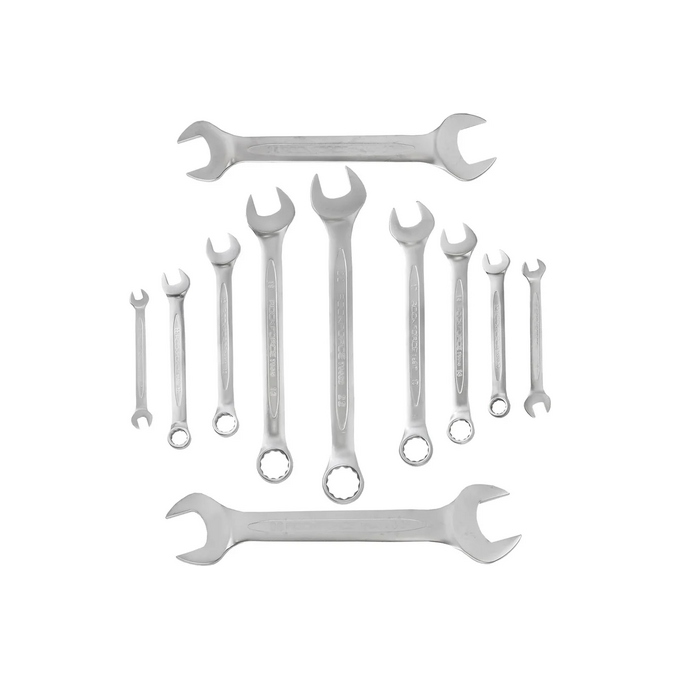 Набор включает в себя рожковые ключи 6х7, 8х9, 24х27, 30х32 мм и комбинированные ключи: 10, 11, 12, 13, 14, 17, 19, 22 мм.