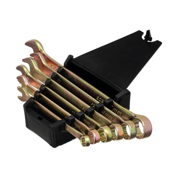Набор комбинированных ключей предназначен для слесарно-монтажных работ с резьбовыми соединениями размером от 8 до 17 мм. Наличие рожкового и кольцевого зева делает каждый ключ универсальным в применении. Накидные головки с 12-гранным профилем надежно удерживают крепежи, уменьшая риск их деформации. Ключи будут полезны при проведении строительных и ремонтных работ, пригодятся для сборки и разборки оборудования, а также необходимы в быту.