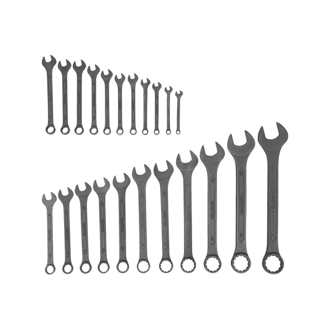 Набор комбинированных ключей включает 22 инструмента из стали CrV, с фосфатированной поверхностью. Соответствует ГОСТ 16983. Предназначен для откручивания и закручивания крепежа размером 6-22 мм с 6-гранным или 12-гранным профилем головки.