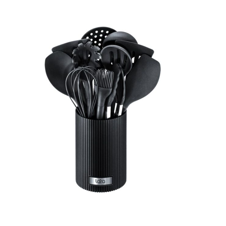 Набор кухонных принадлежностей LARA LR07-81 в черном цвете – это стильный многофункциональный комплект кухонных аксессуаров. В комплекте 11 инструментов для приготовления пищи и подставка для удобного хранения. Кухонные принадлежности из силикона обладают антипригарным покрытием, выдерживают высокие температурные нагрузки (до 220 °С) и абсолютно безвредны для здоровья. Не оставляют царапин, подходят для посуды с антипригарным покрытием. Компактный набор не займет много места на вашей кухне, подходит для повседневного использования и легко чистится. Получайте удовольствие от готовки с кухонными принадлежностями Lara!