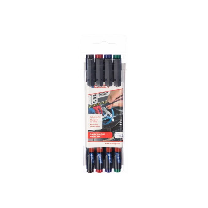Набор маркеров для маркировки кабелей EDDING E-8407#4S 0.3мм черный, красный, зеленый, синий 09-3997 подойдет для нанесения мелких букв, разметки кабелей по цвету. Чернила маркеров обладают стойкостью к пыли, влаге, механическому истиранию, солнечным лучам. В набор входит 4 маркера: синий, зеленый, красный, черный.