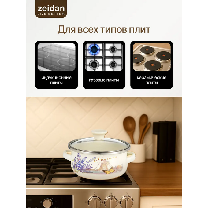 Совместимые плиты: Для индукционных плит, Для газовых плит, Для стеклокерамических плит, Для электрических плит