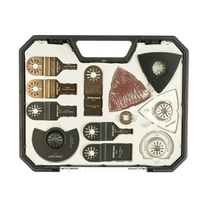 Набор насадок №8 ПРАКТИКА 240-577 используется совместно с многофункциональным инструментом. Применяется при обработке дерева, ДСП, фанеры, пластика, листов ГКЛ, стали, цветных металлов, плитки, камня. Набор включает пятнадцать насадок, позволяющих производить различные виды работ: выборка пазов, подрезание внутренних углов, вырезание проемов, резка плинтусов, пластиковых труб и т. д.