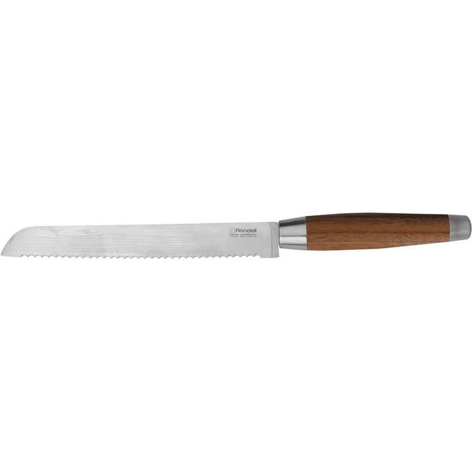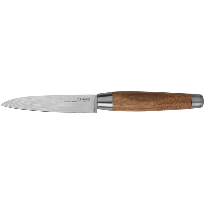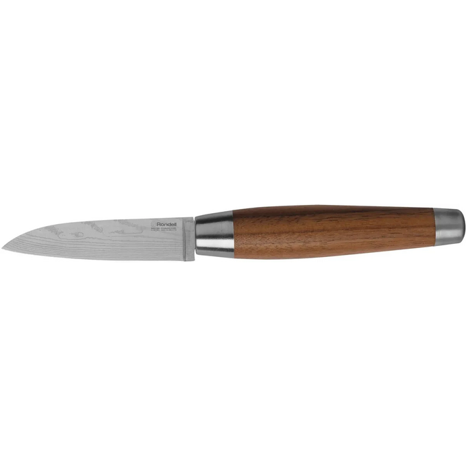 Материал клинка: высококачественная немецкая нержавеющая сталь X50CrMoV15. Не подходит для посудомоечной машины. Двусторонняя заточка лезвий. Толщина клинка 2.5 мм. Материал рукоятки - дерево орех, металлическая насадка.
