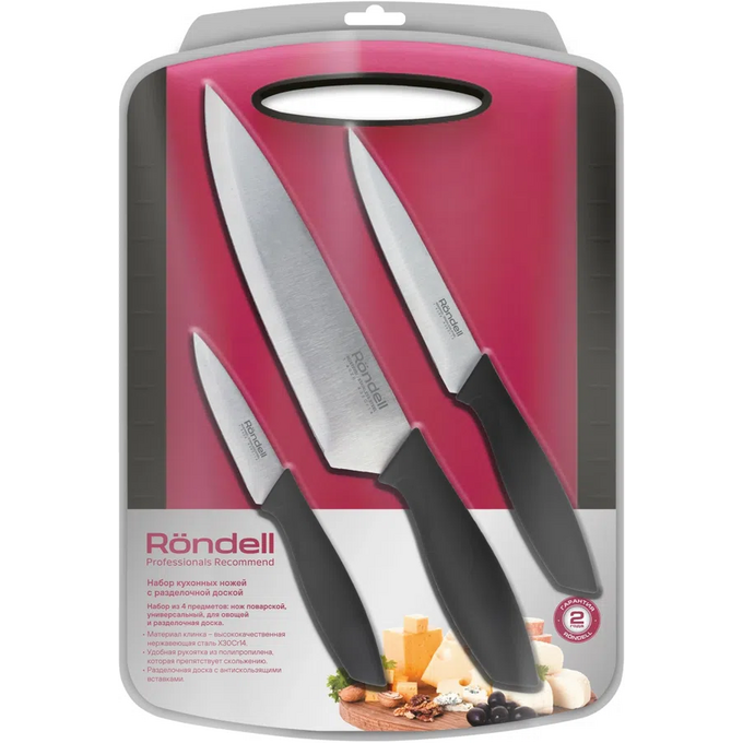 Материал клинка: высококачественная нержавеющая сталь X30Cr14. Материал рукоятки: прорезиненные с удобным хватом, не позволяющим руке скользить. Особенности клинка: двусторонняя заточка лезвий. В комплекте разделочная доска: безопасна - не скользит и приятна на ощупь.