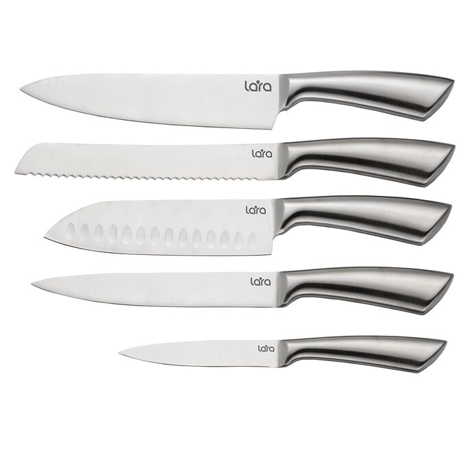 Набор ножей LARA LR05-66 из прочной нержавеющей стали 5 в одном, имеют идеальное распределение веса и баланса благодаря точно спроектированной форме. Для удобства и защиты ножи оснащены больстером. Эргономичная форма рукояти позволяет минимизировать усталость рук в процессе работы. В комплекте: шеф-нож, нож для нарезки хлеба, универсальный нож, нож для нарезки, нож азиатского типа сантоку, который отличается особой формой лезвия и остротой заточки.
