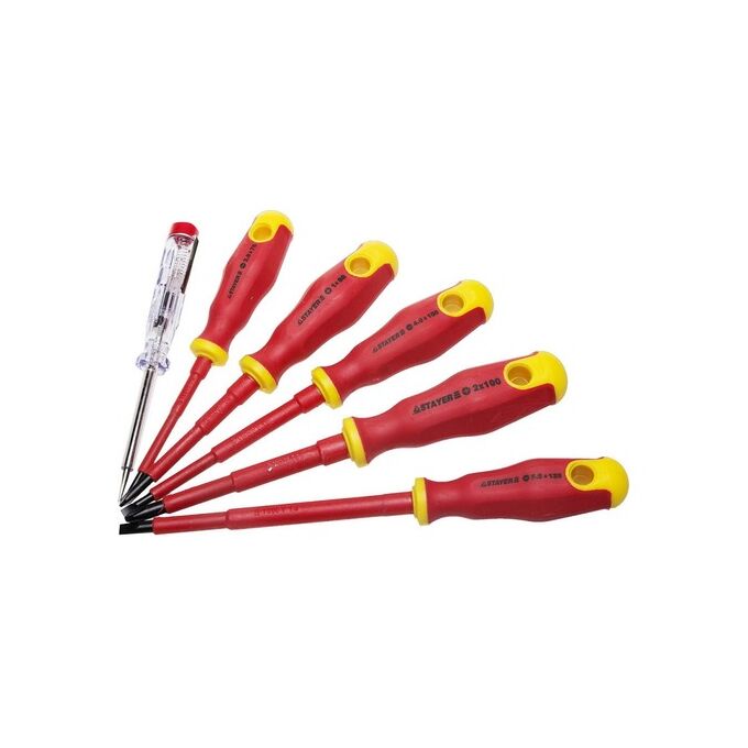 Описание: Набор слесарных отверток STAYER предназначен для выполнения электромонтажных работ под напряжением до 1000В. Стержень из хромованадиевой стали покрыт изоляционным материалом. Оксидированный намагниченный наконечник обеспечивает удобство в работе. Эргономичная изолированная двухкомпонентная рукоятка.