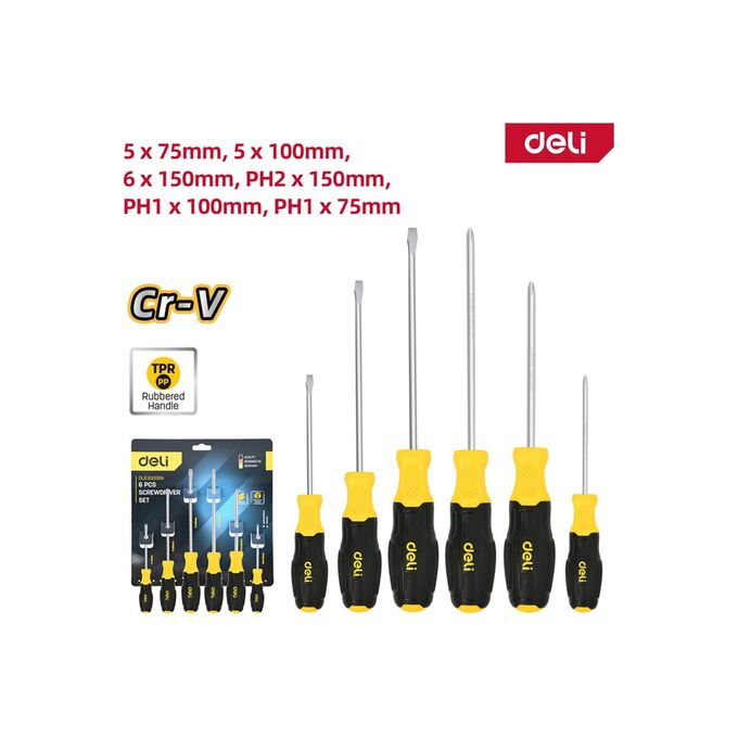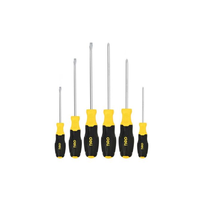 Набор отверток Deli DL630006N 6шт SL5x75 + SL5x100 + SL6x150 + PH1x75 + PH1x100 + PH2x150 сталь Cr-V, двухкомпонентная прорезиненная рукоять