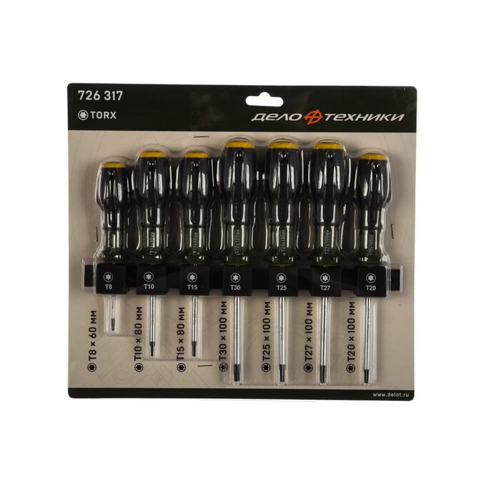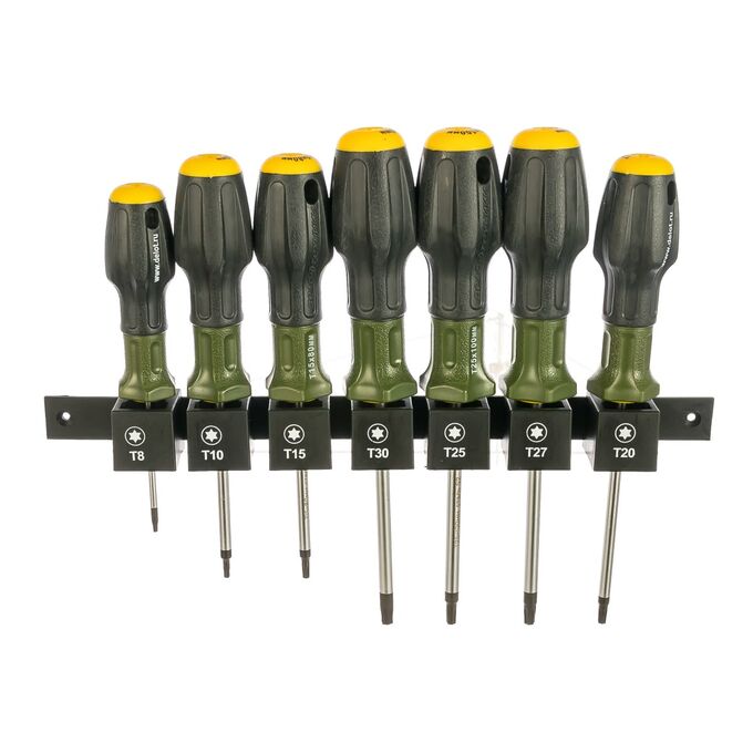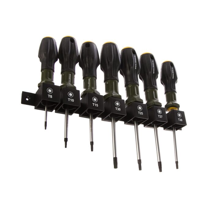 Набор отверток включает в себя наиболее распространенные размеры отверток типа Torx. Удобная рельефная рукоятка обеспечивает простоту вращения и удобство работы. Вместе с набором поставляется держатель, который делает хранение и транспортировку инструмента более надежной.