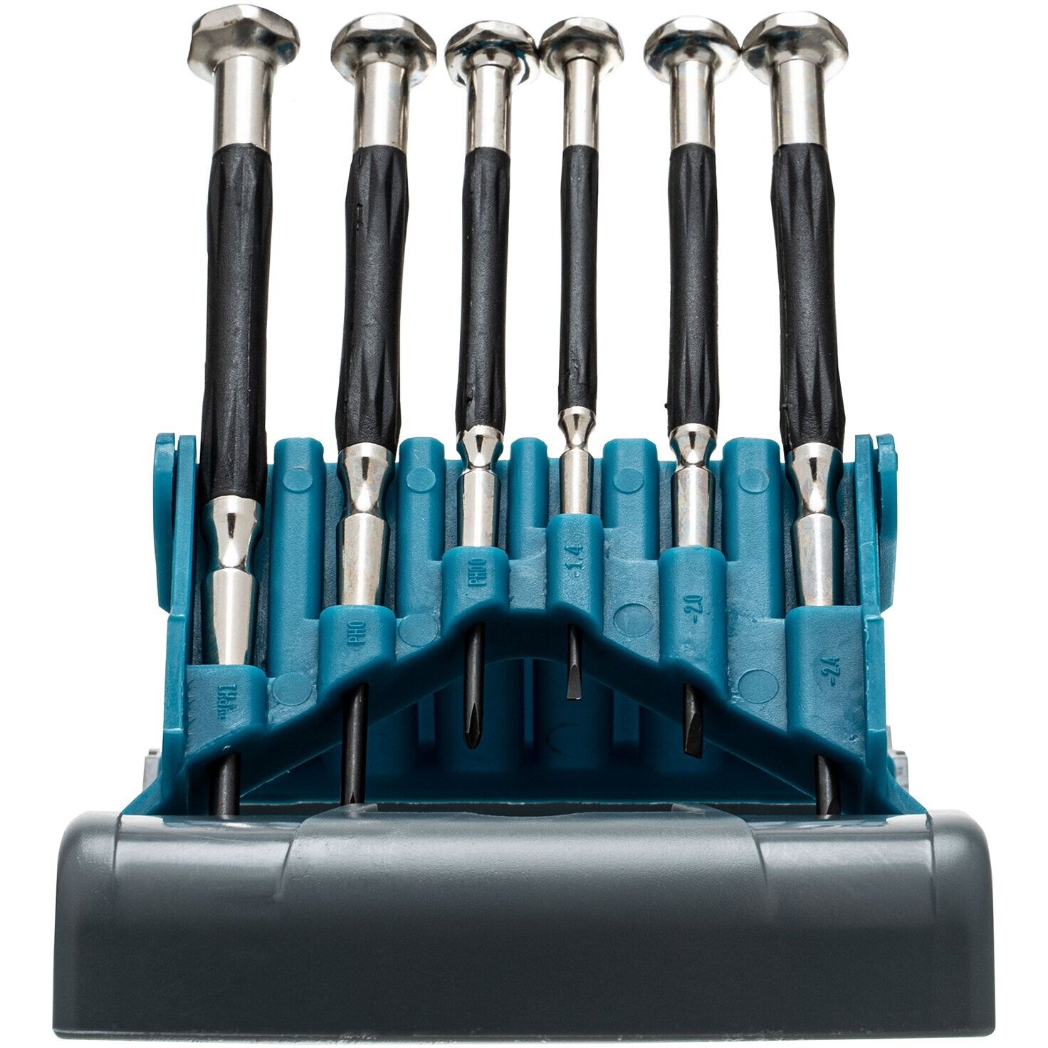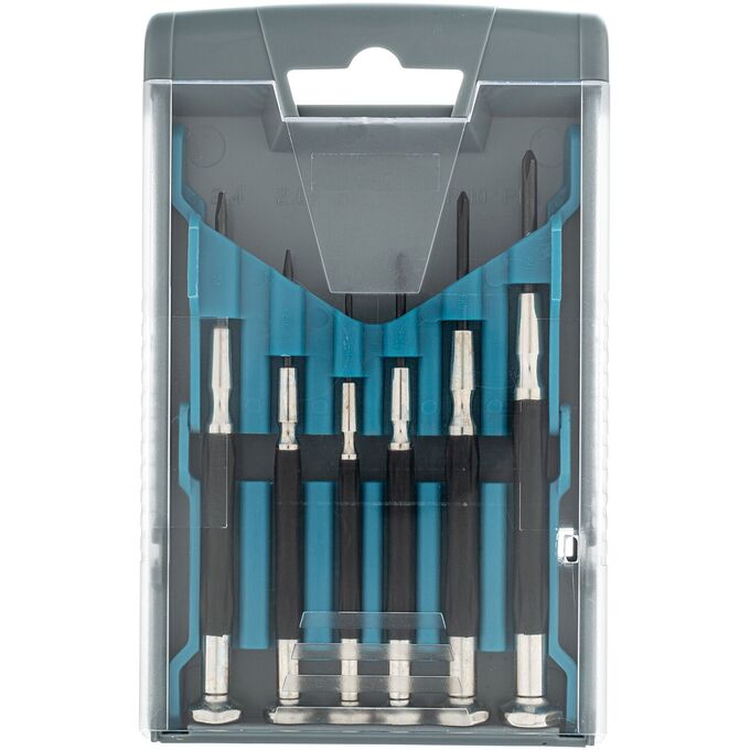 Набор отверток для точной механики используется для механических работ с мелкими деталями. В комплекте 6 отверток ( РН 00, РН 0, РН 1, SL 1.4, SL 2.0, SL 2.4 ). Стальные стержни с наконечниками покрытыми специальным антикоррозийным покрытием. Твердость материала 52?54 HRc. Рукоятки имеют противоскользящее покрытие из термопластичного эластомера.