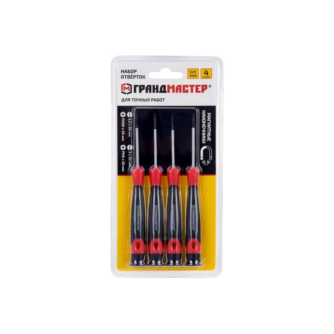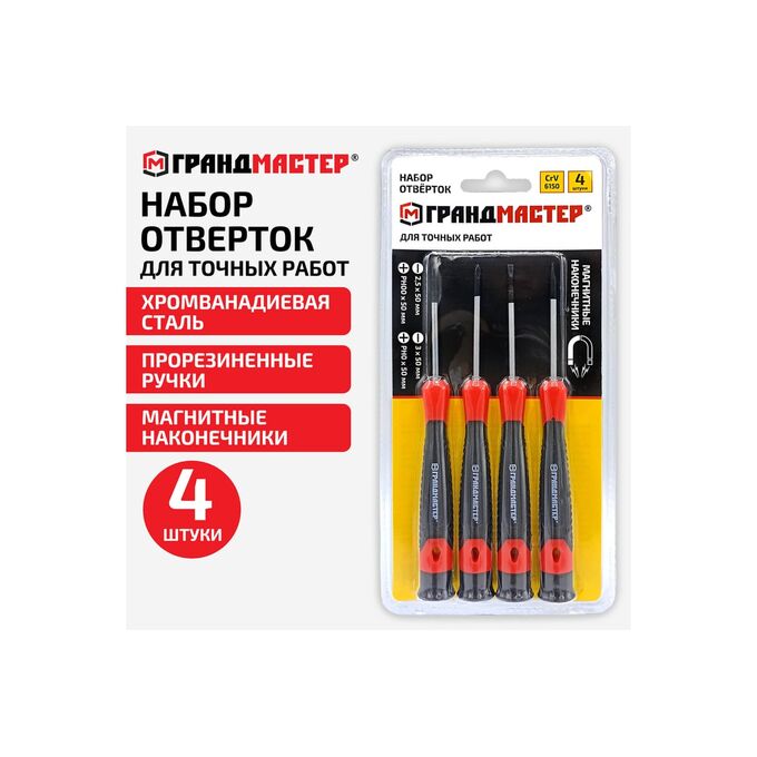 Набор отверток Грандмастер 671329 для точных работ SL/PH, 4шт, CrV, двухкомпонентные рукоятки