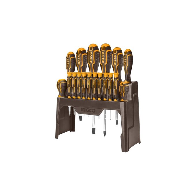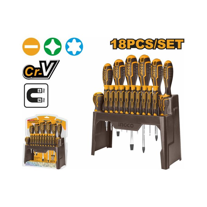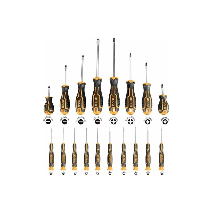 Универсальный набор отверток 18 шт INGCO HKSD1828 предназначен для работ с крепежом. Имеет в комплекте 8 отверток и 10 прецизионных отверток с разным шлицем для точных работ с крепежом на платах и деталях электроники.