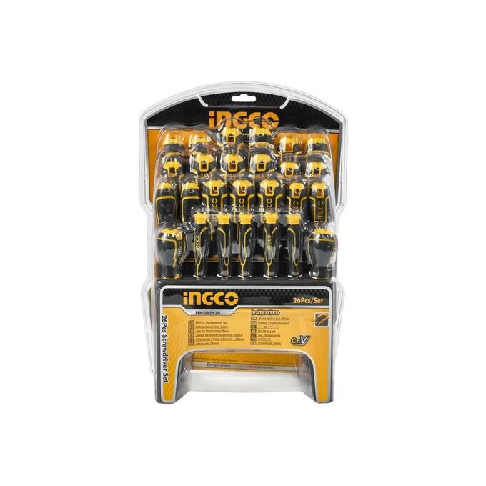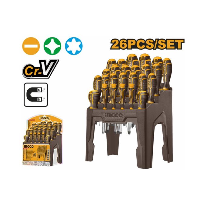 Набор отверток INGCO HKSD2628 содержит 26 отверток различного размера, позволяющих выполнять большой спектр работ с крепежом.
