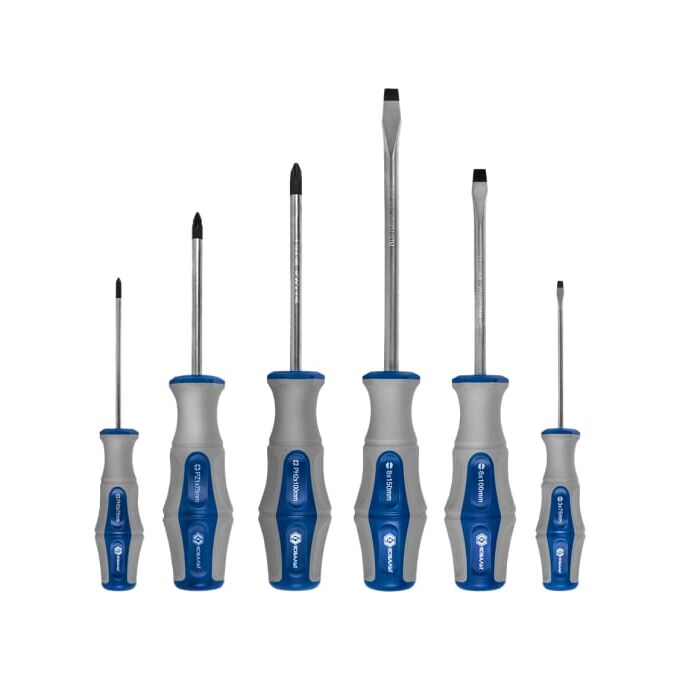 Набор отверток предназначен для отвинчивания/завинчивания резьбовых соединений. Рабочие части комплекта выполнены из хром-ванадиевой стали и имеют магнитные наконечники, которые примагничивают крепеж во время работы. Для прочности инструменты подвергаются термической обработке до твердости 51 - 54 HRC.
