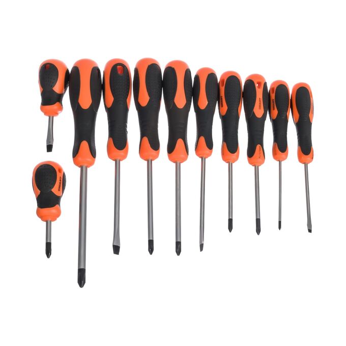 Набор отверток с магнитным наконечником подойдет для работы с крепежными соединениями. В комплект входят четыре отвертки с прямым шлицем Sl (75 мм, 2 по 100 мм и 38 мм), пять отверток с крестовым шлицем Ph (2 по 75 мм, 100 мм, 125 мм и 38 мм) и две отвертки с шлицем Pz (75 мм и 100 мм).