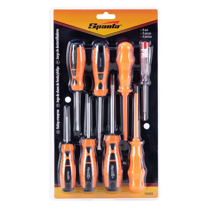 Набор отверток SPARTA 135435 используется для монтажа резьбовых соединений. В комплекте пять отверток PH, SL, две диэлектрических отвертки и отвертка-пробник для работ под напряжением до 220 В. Имеют удобную рукоятку. Стержень намагничен.