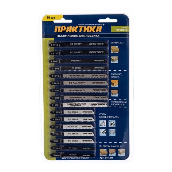 Набор пилок для лобзика ПРАКТИКА 244-391 универсальный, 16 шт