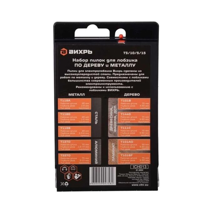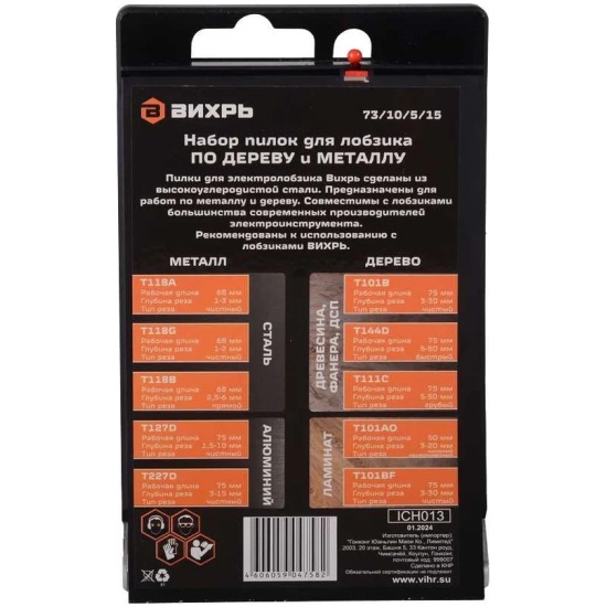 Набор пилок Вихрь 73/10/5/15 для лобзика по дереву и металлу 10шт