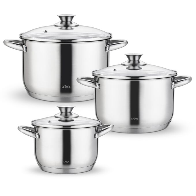 В комплекте 3 кастрюли: 2.1 л, 3.9 л, 6.5 л; 3 крышки