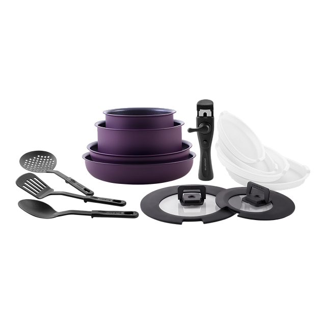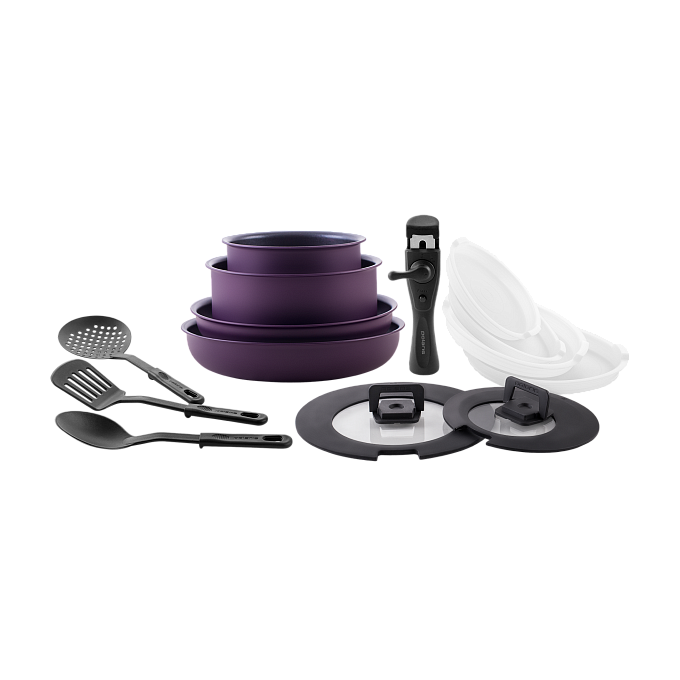 Ковш 16 см ковш 20 см; сковорода 24см; сковорода 26см; пластиковые крышки для хранения 16/20/24/26 см; крышки универсальные 2 шт с силиконовым ободом 16/18/20, 24/26 см; кулинарная ложка; кулинарная лопатка; шумовка; съемная ручка
