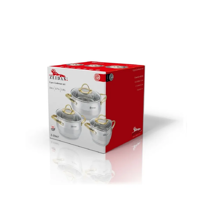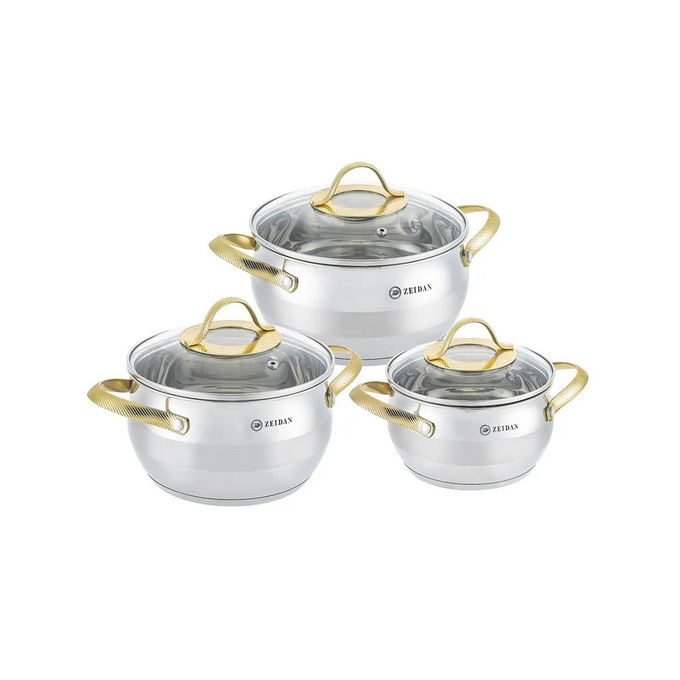 Набор посуды ZEIDAN Z-50667 — это элегантный и функциональный комплект, состоящий из 6 предметов, который станет прекрасным дополнением к любой кухне. В набор входят три кастрюли с крышками, объемами 1.9 литра (диаметр 16 см), 2.7 литра (диаметр 18 см) и 3.6 литра (диаметр 20 см), что позволяет готовить разнообразные блюда для всей семьи.
