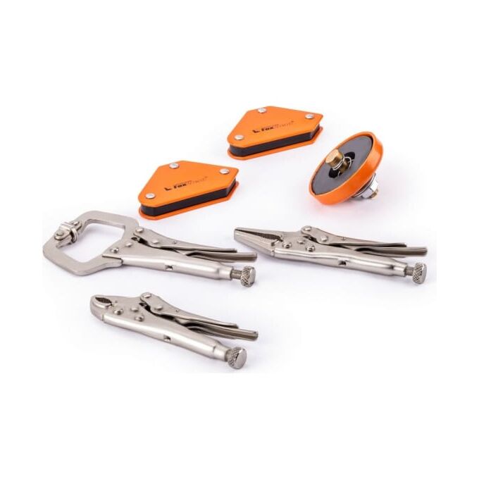 Набор приспособлений для сварки MULTI-6 Foxweld 5392 состоит из шести позиций. Два магнитных угольника, одна магнитная клемма заземления и три струбцины.