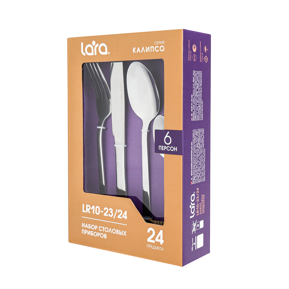 Столовые приборы LARA LR10-23/24 Калипсо – это сочетание превосходного качества и современного дизайна. В наборе 24 предмета на 6 персон. Каждый предмет идеально сбалансирован, ручки имеют специальную форму и отлично лежат в руке. Комплект изготовлен из пищевой нержавеющей стали, не имеет запаха и сохраняет вкус и аромат продуктов. Все изделия высокого качества и очень прочные, не гнутся, имеют длительный срок службы, отлично сохраняют эксплуатационные свойства. Столовые приборы Lara подходят как для ежедневного использования, так и для сервировки праздничного стола. Можно мыть в посудомоечной машине.