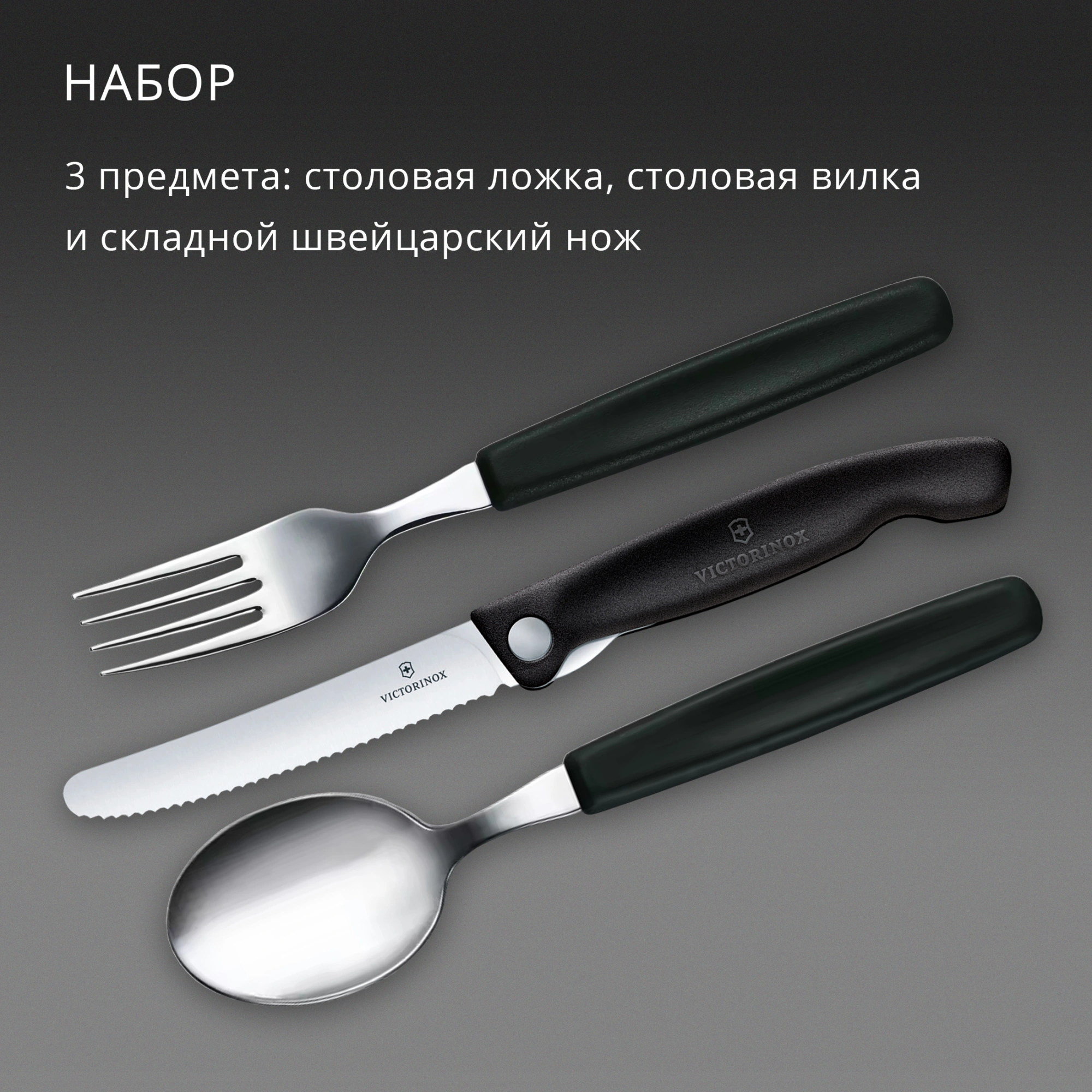 В набор Victorinox 6.7192.3F для офиса/пикника входит складной нож с серрейторной заточкой, ложка и вилка. Набор выполнен из высококачественной нержавеющей стали.