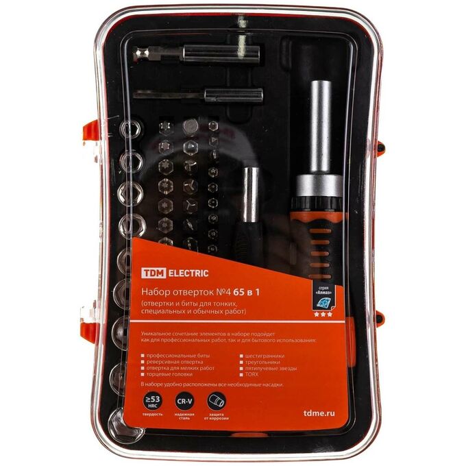 Набор TDM Алмаз SQ1019-0204 две отвертки (реверсивная, и тонкая, в комп.биты и головки, №4) 65 предметов