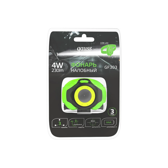 Фонарь налобный Gauss GFL303 черный/зеленый 4Вт лам.:светодиод. AAAx3 (GF303)