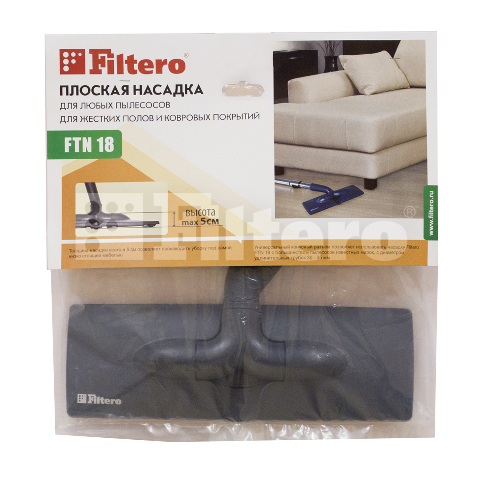 Насадка Filtero FTN 18 с шириной рабочей зоны 30 см. Конусный соединитель позволяет использовать насадку с большинством пылесосов известных марок, с диаметром удлинительной трубки 30-35 мм.