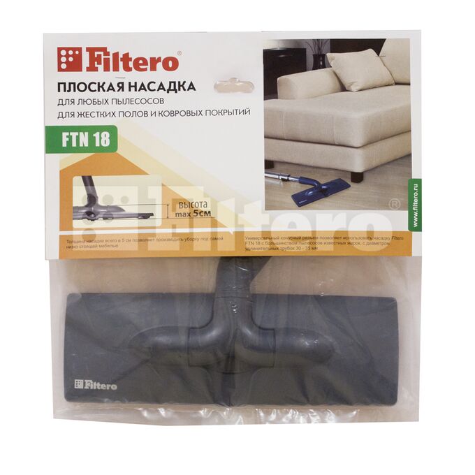 Плоская и маневренная универсальная насадка Filtero FTN 18 предназначенная для уборки ламинированных и паркетных полов, или ковровых покрытий с мелким ворсом.