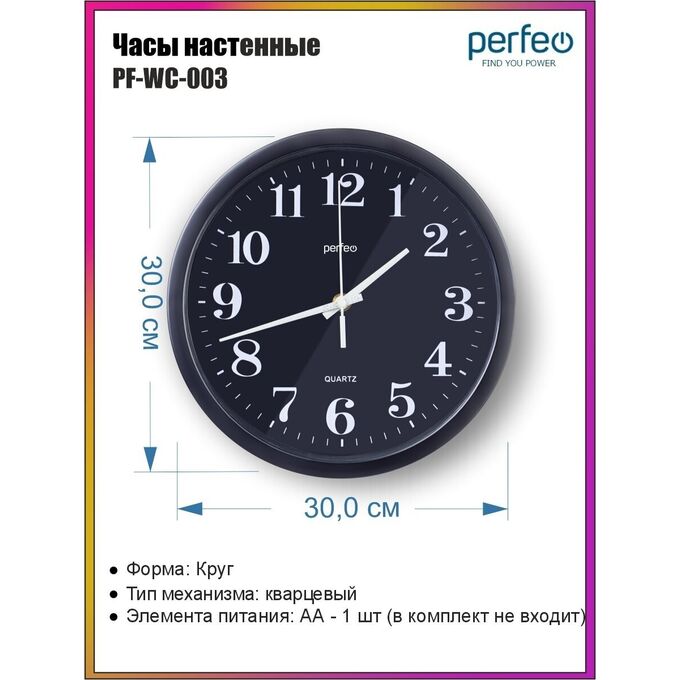 Настенные часы Perfeo PF-WC-003, PF_C3065 круглые д. 30см, чёрный корпус/чёрный циферблат