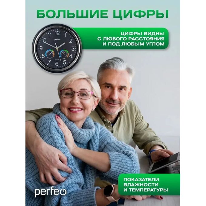 Настенные часы Perfeo "PF-WC-012", круглые д. 30 см, чёрный корпус / чёрный циферблат