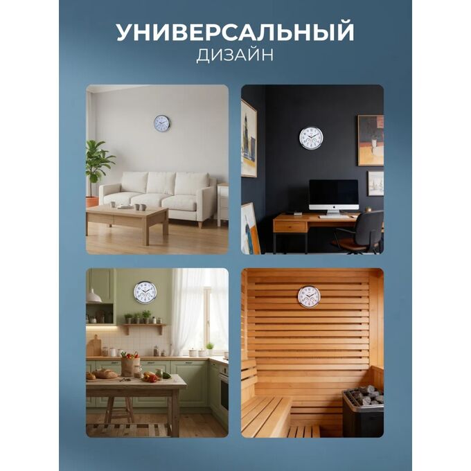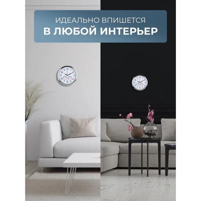 Модель работает на батарейках, что делает её удобной и мобильной – розетка не требуется.Стильные и бесшумные часы с функцией отображения температуры и влажности легко читаются даже с расстояния, а их лаконичная круглая форма подходит для любого интерьера.