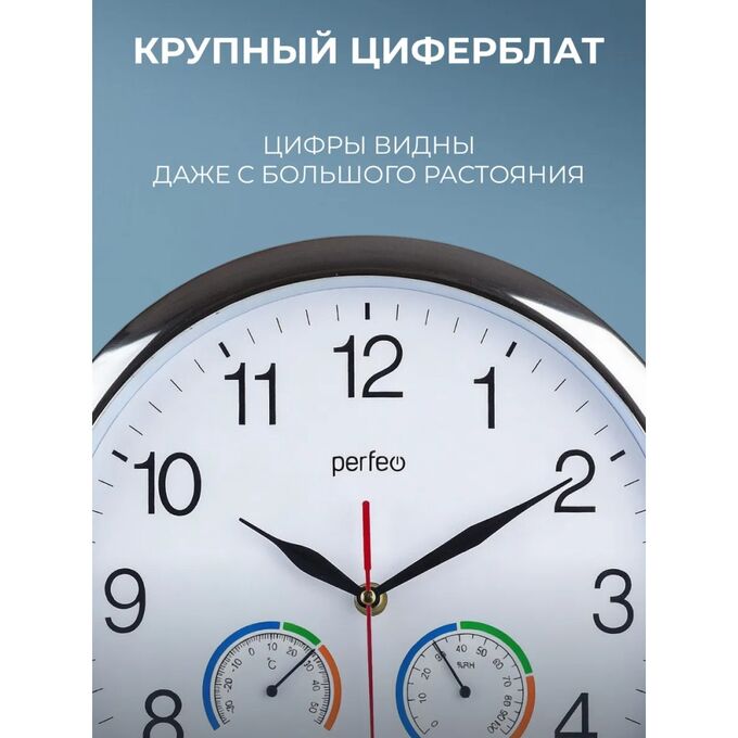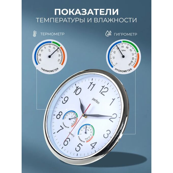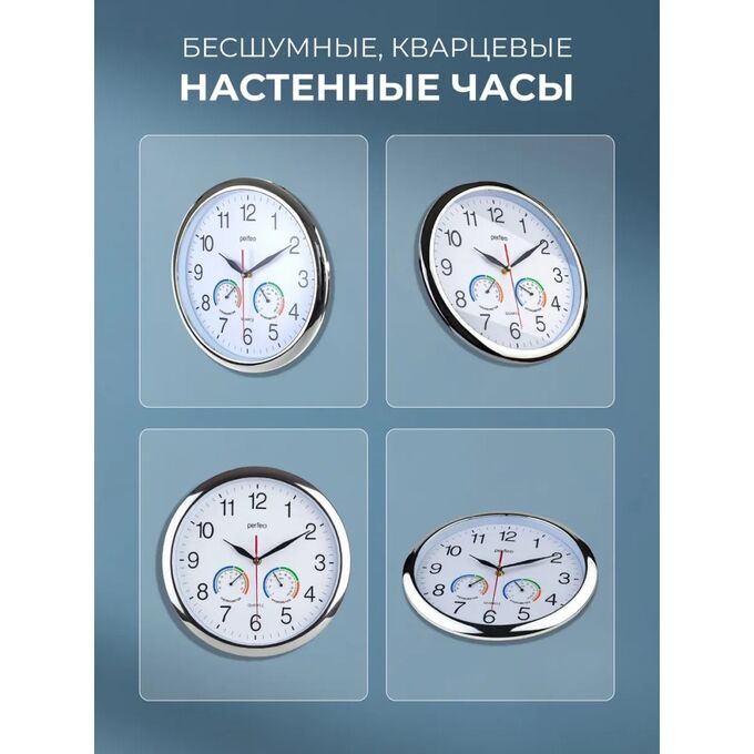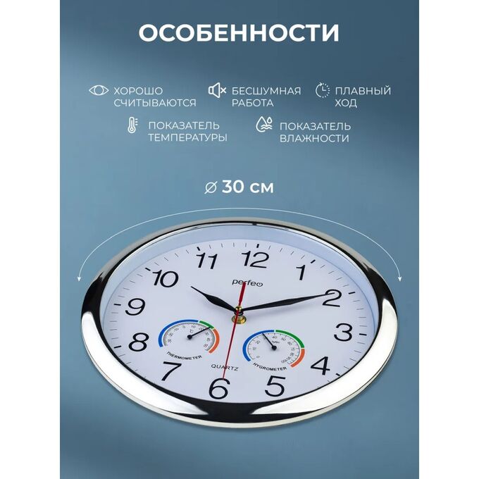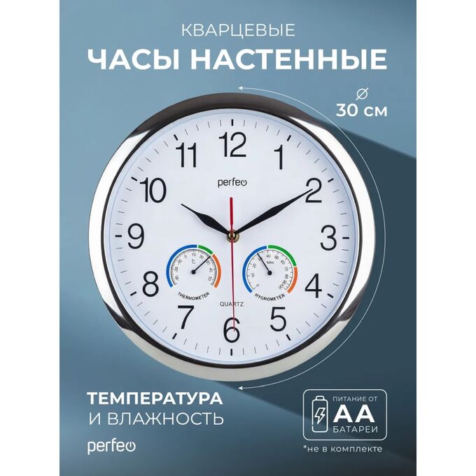 Настенные часы Perfeo "PF-WC-012", круглые д. 30 см, серебряный корпус / белый циферблат, (Арт. PF_D0379)