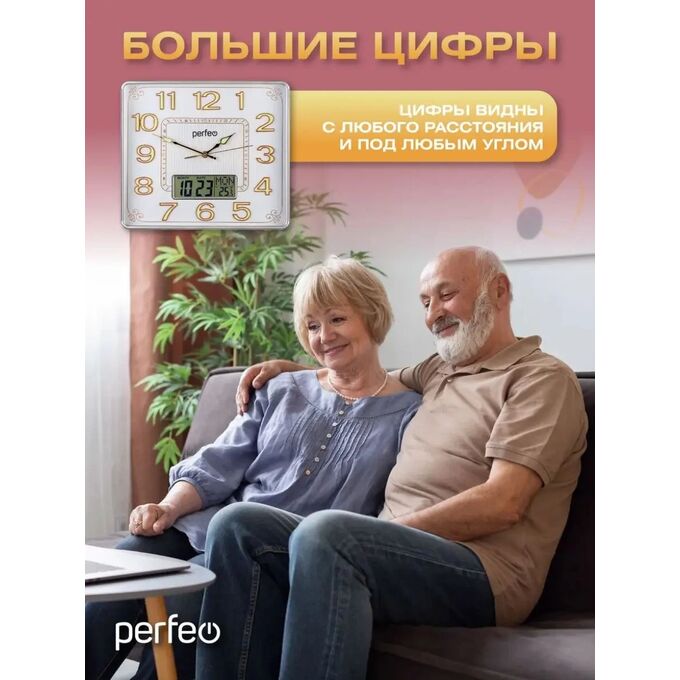 Настенные часы Perfeo "PF-WC-018", прямоугольные 34*30 см, серебряный корпус / белый циферблат