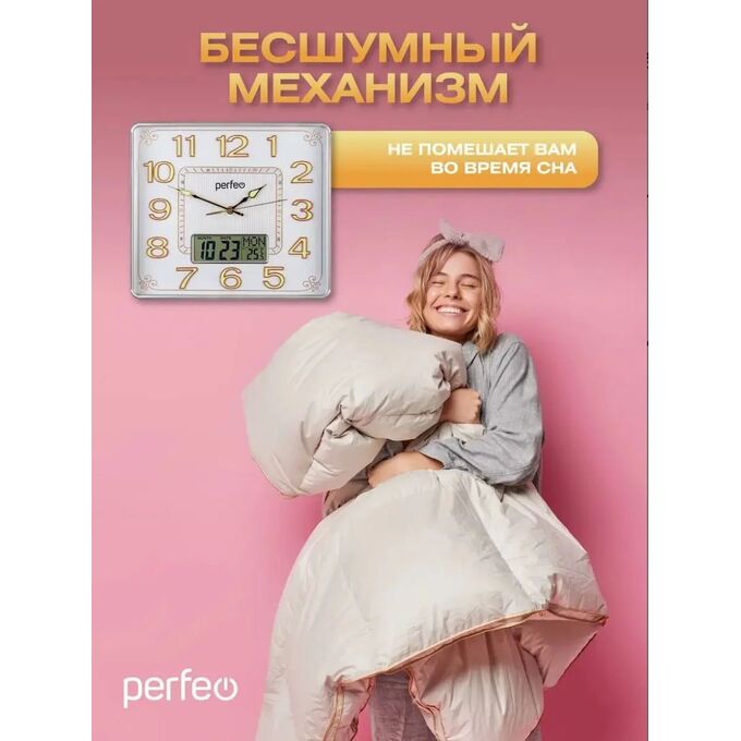 Часы настенные бесшумные прямоугольные с термометром и календарем Perfeo