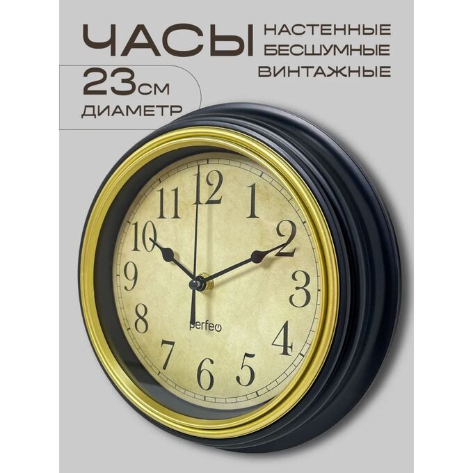 Настенные часы Perfeo "PF-WC-022"(С1) круглые д. 23 см, коричневый корпус / бежевый циферблат, (Арт. PF_E2069)