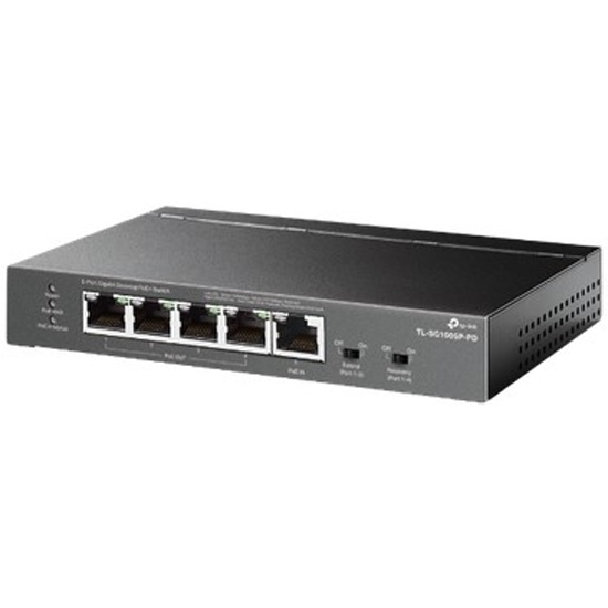 Настольный коммутатор TP-Link TL-SG1005P-PD, с 5 гиг. портами (1 порт с входящим PoE++, 4 порта с исходящим PoE+), бюджет PoE: 9, 21, 47 или 66Вт